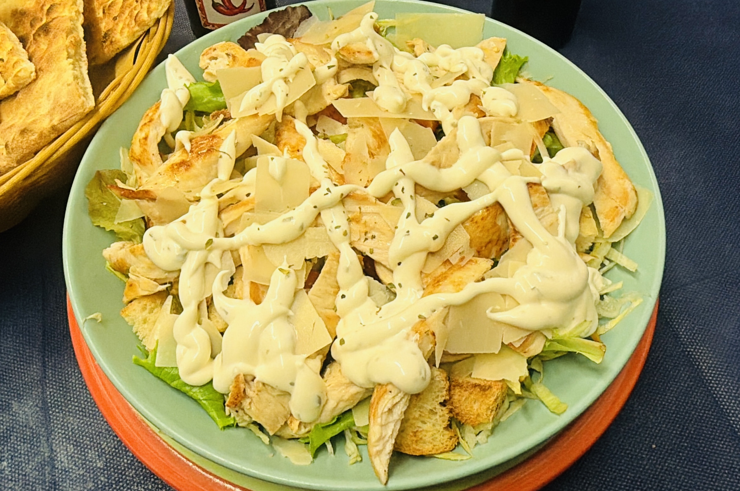 Misticanza, pomodorini ciliegino, scaglie di Grana, filetto di pollo alla piastra, cubetti di pane, Caesar dressing.