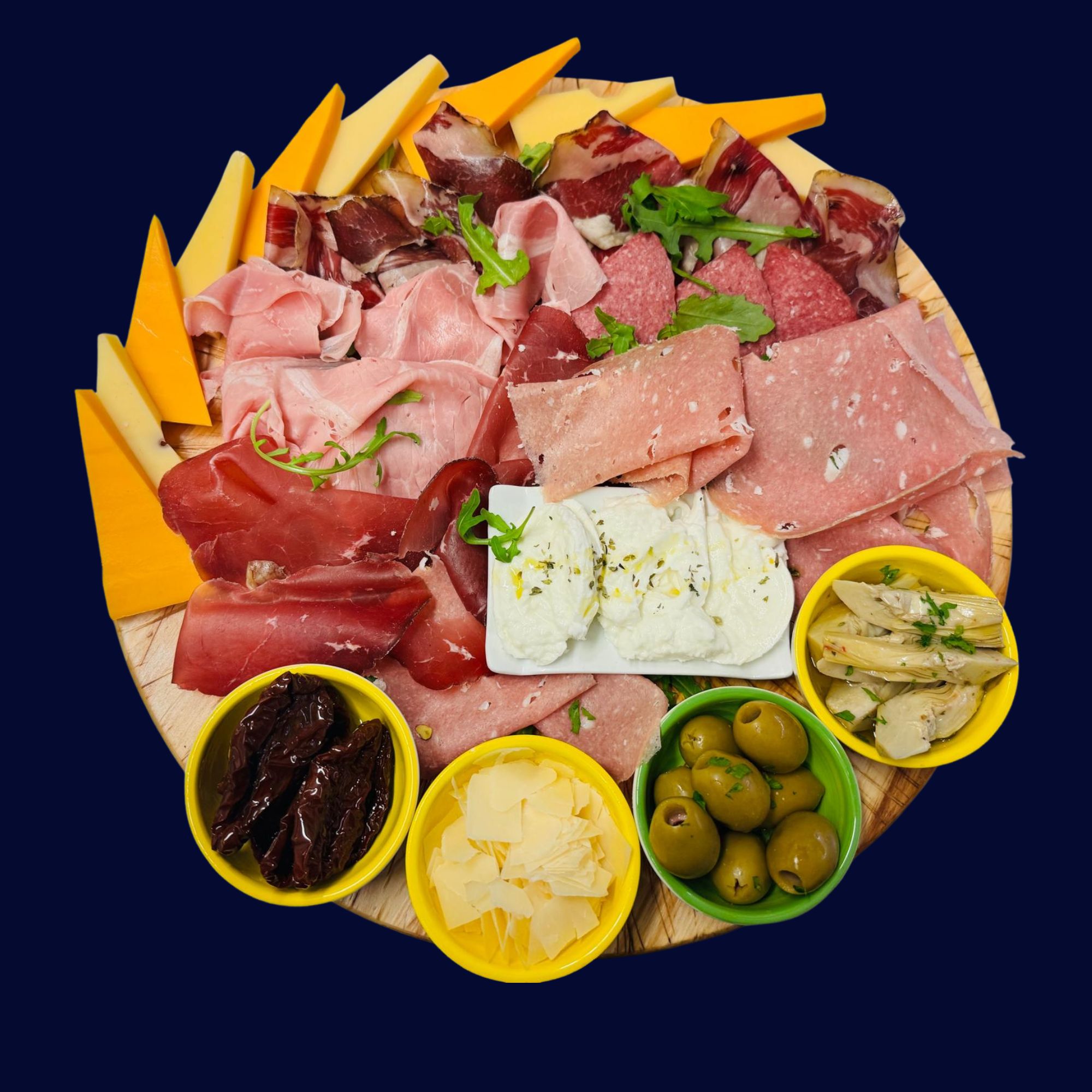 Salumi, formaggi, pomodoro secco, olive Verdi, Carciofi , mozzarella di bufala, focaccia.