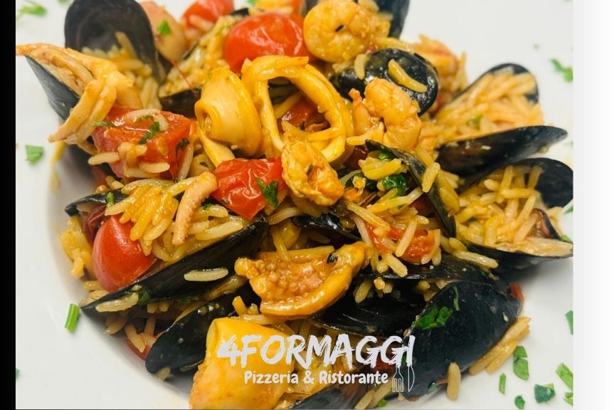 Riso basmati, cozze, calamari*, gamberetti*, cipolla, peperoni e piselli, olio evo.